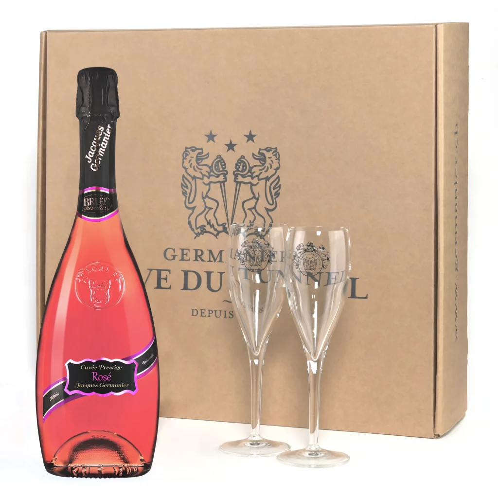 Entdecken Sie unseren Brut Rosé, der in einer edlen Schachtel mit zwei Gläsern angeboten wird. Seine zarte Himbeerfarbe kündigt einen Moment der Frische und Leichtigkeit an. Zu den köstlichen Aromen von Erdbeeren und Waldbeeren gesellt sich ein lebhafter und harmonischer Mund, der für einen Moment der Verkostung voller Finesse sorgt. Ein ideales Set zum Verschenken oder zum Genießen zu zweit.