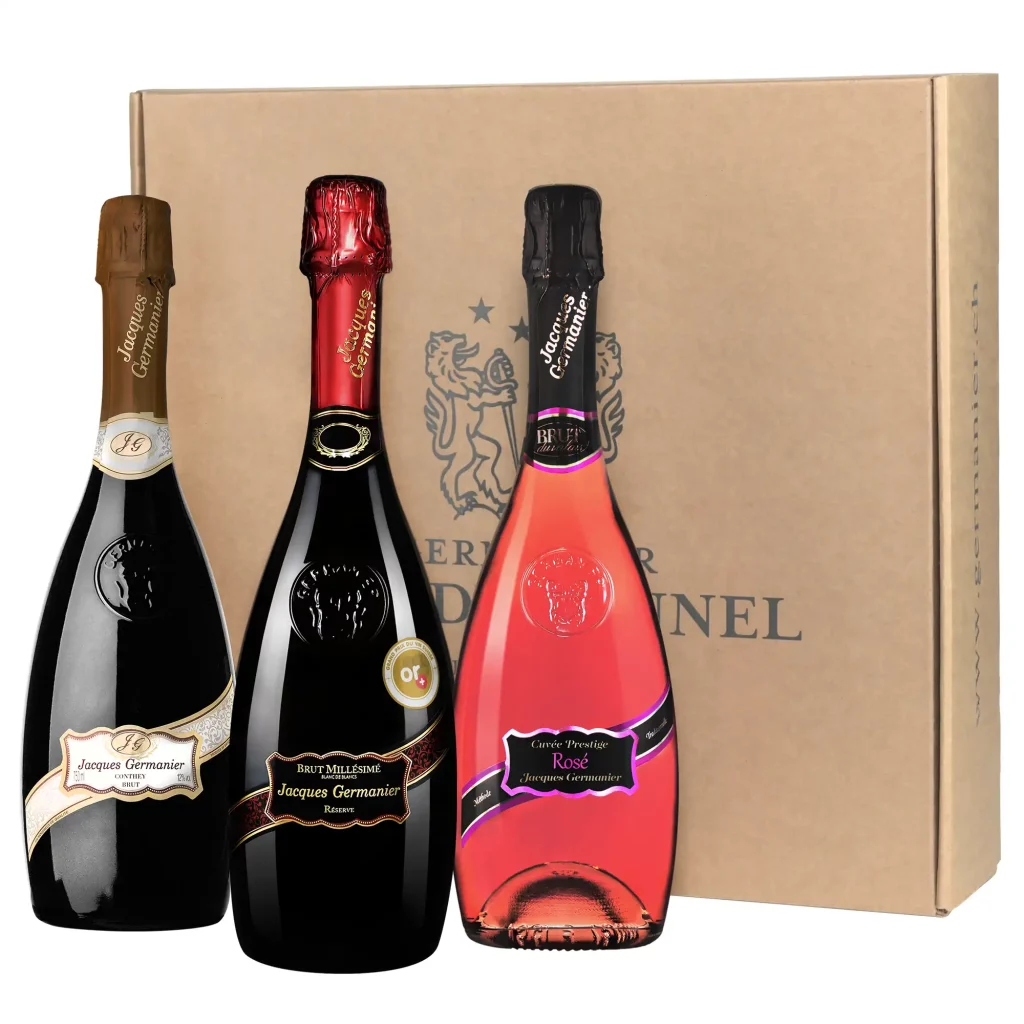 Offrez ou offrez-vous un voyage sensoriel unique avec notre coffret de trois bouteilles : le Brut Rosé, le Brut du Valais Millésimé et le Brut Réserve. Trois expressions raffinées de notre savoir-faire, réunies dans un écrin élégant.