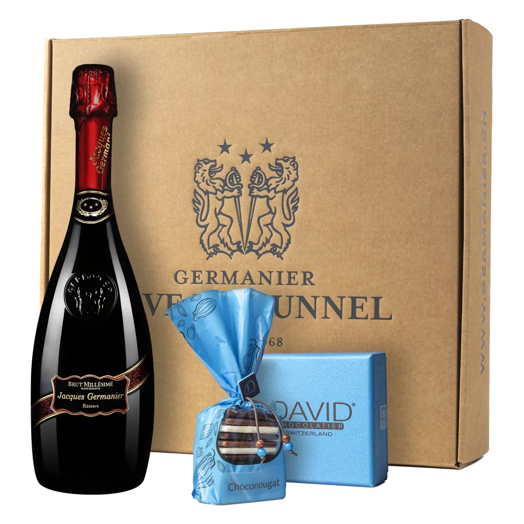 Notre Brut du Valais Millésimé, accompagné de deux coupes élégantes, est une invitation à la dégustation raffinée. Issu de grappes de chardonnay cueillies à parfaite maturité, il révèle après 36 mois de vieillissement une effervescence fine, des arômes délicats de fruits mûrs et de brioche. Un vin complexe et élégant, à partager pour des moments d’exception.