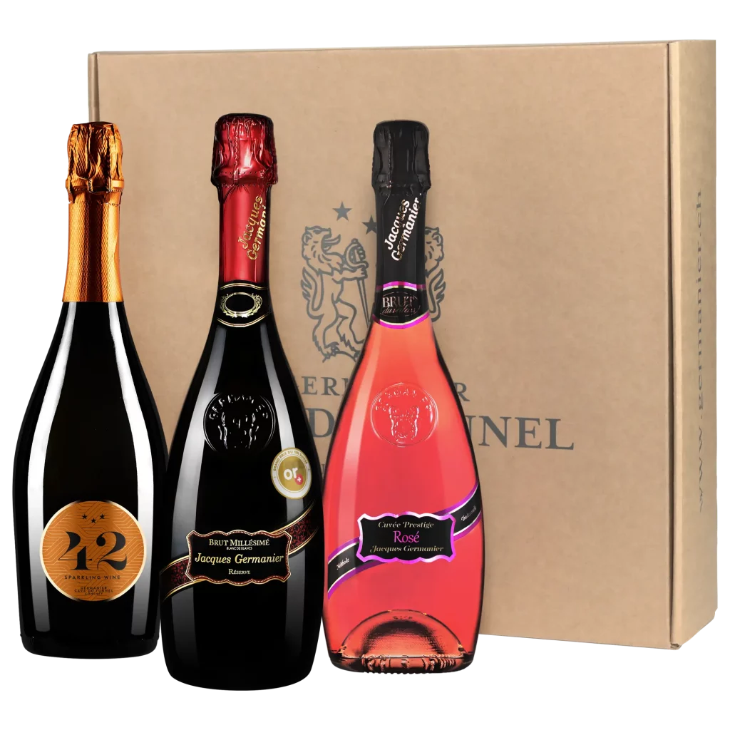 Offrez ou offrez-vous un voyage sensoriel unique avec notre coffret de trois bouteilles : le Brut Rosé, le Brut du Valais Millésimé et notre sparkling wine 42. Trois expressions raffinées de notre savoir-faire, réunies dans un écrin élégant.